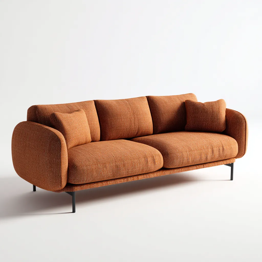 Rivestimento in tessuto di colore terracotta con texture piacevole al tatto. La struttura interna assicura solidita e durata mentre i piedini in metallo garantiscono stabilita e uno stile contemporaneo.