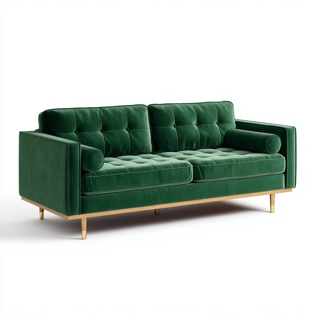 Rivestimento in tessuto vellutato di colore verde scuro con finitura morbida al tatto. La struttura interna solida garantisce durata mentre i piedini in metallo assicurano stabilita e valorizzano il design contemporaneo.