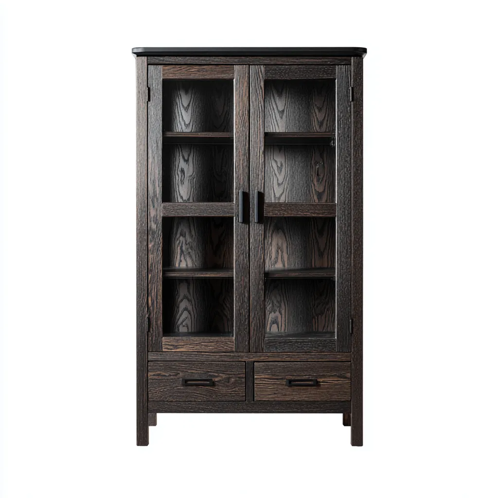 Realizzata in legno abbinato a vetro. La finitura in tonalità marrone scuro valorizza l'aspetto naturale della superficie mantenendo un carattere sobrio e raffinato.