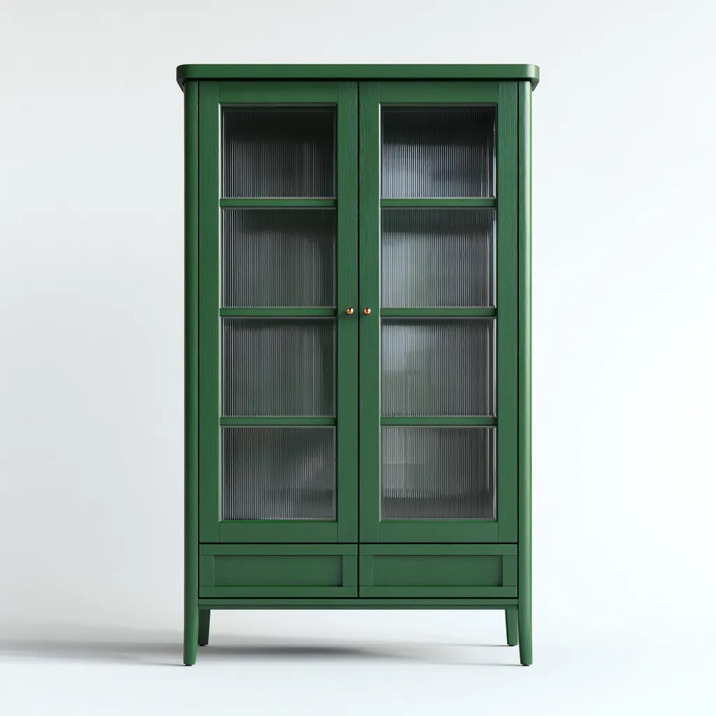 Struttura realizzata in legno combinato con vetro. La finitura verde uniforme valorizza le superfici e richiama uno stile nordico moderno adatto a spazi luminosi e curati.
